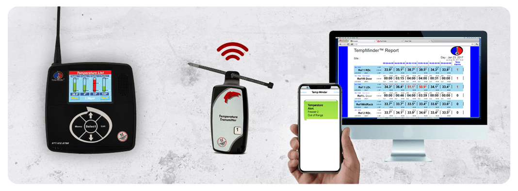 Temp Minder™ consists of wireless temperature probes that transmit temperature data to a gateway. The gateway collects and displays data, which is also sent to the Temp Minder Online™ website via cloud technology. When the temperatures are out of range an audible alarm will sound. Additionally, off-site temperature alerts are sent via email, text message and/or automated voice messages.